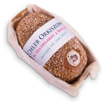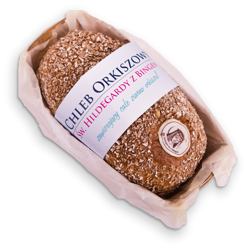Chleb orkiszowy św. Hildegardy z Bingen to pieczywo wytwarzane według starodawnej receptury tej znamienitej benedyktynki na bazie pełnoziarnistej mąki orkiszowej, grysu ziarnka orkiszowego oraz płatków orkiszowych. Dodatkowo w składzie znaleźć można ziarna słonecznika, słód jęczmienny i razowy zakwas. Zboże orkiszowe cenione jest głownie za dużą zawartość białka oraz nienasyconych kwasów tłuszczowych. Spożywanie orkiszu, dzięki sporej zawartości błonnika, poprawia również prace układu pokarmowego. Orkisz to dawna odmiana pszenicy, która aktualnie powróciła do łask i cieszy się ogromną popularnością wśród wielbicieli wypieków.